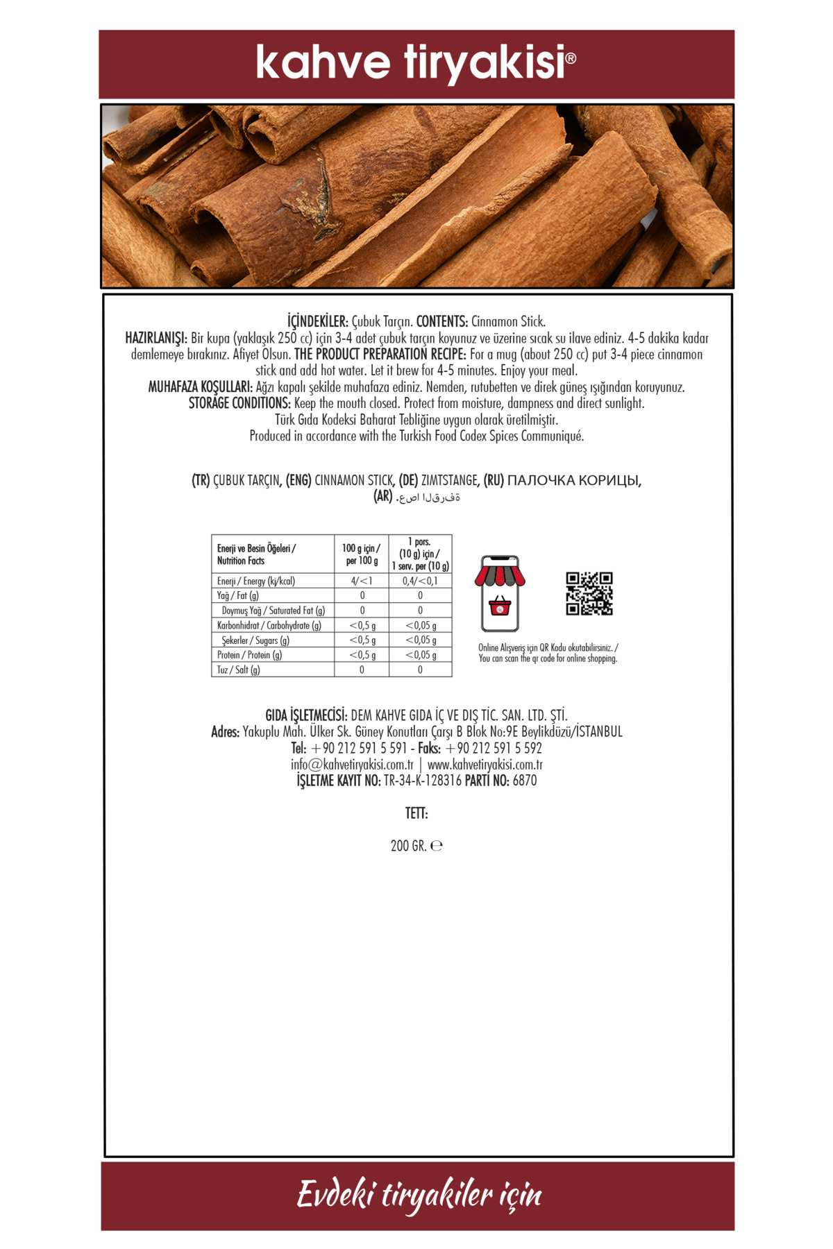 Çubuk Tarçın 200 gr Tadım Notu: Çubuk tarçın, yoğun ve sıcak baharatlı aroması ile tanınır. Taze tarçın çubuğunun kokusu, tatlımsı ve hafif odunsu notalar içerir, bu da onu hem yiyecek hem de içeceklerde popüler bir bileşen yapar. İlk tadımda, dilde hafif bir sıcaklık hissi bırakan ve hafif acımsı bir tat veren güçlü bir baharatlılık hissedilir. Ardından, belirgin tatlı ve vanilyamsı alt tonlar ortaya çıkar, bu da tarçını karmaşık ve zengin bir lezzet profiline sahip kılar. Çubuk tarçının doğal tatlılığı, onu özellikle sıcak içecekler, tatlılar ve çeşitli yemeklerde lezzet artırıcı bir bileşen olarak ideal kılar. Çubuk Tarçının Sağlığa Faydaları Antioksidan Özellikler : Çubuk tarçın, serbest radikallerle savaşan ve hücre hasarını önleyen güçlü antioksidanlar içerir. ; Etki : Vücuttaki inflamasyonu azaltarak kronik hastalık riskini düşürebilir. ; Kan Şekerini Düzenleme : Tarçının kan şekeri seviyelerini dengeleyici etkisi bulunur, bu da yönetiminde yardımcı olabilir. ; Kalp Sağlığını Destekleme : Tarçın, kan basıncını ve seviyelerini düşürerek kalp hastalıkları riskini azaltabilir. ; Özellikler : Bakteri ve mantarlarla savaşma yeteneği sayesinde enfeksiyonları önleyebilir. ; Beyin Sağlığı : Bilişsel fonksiyonları destekleyerek nörodejeneratif hastalıklara karşı koruyucu olabilir. ; Sindirim Sağlığı : Sindirimi kolaylaştırır ve mide rahatsızlıklarını hafifletebilir. ; Çubuk tarçının hem lezzeti hem de sağlık faydaları, onu mutfakta ve doğal tedavi yöntemlerinde vazgeçilmez bir bileşen yapar. Ancak, fazla tüketimi bazı yan etkilere yol açabileceği için dengeli kullanımı önerilir.;