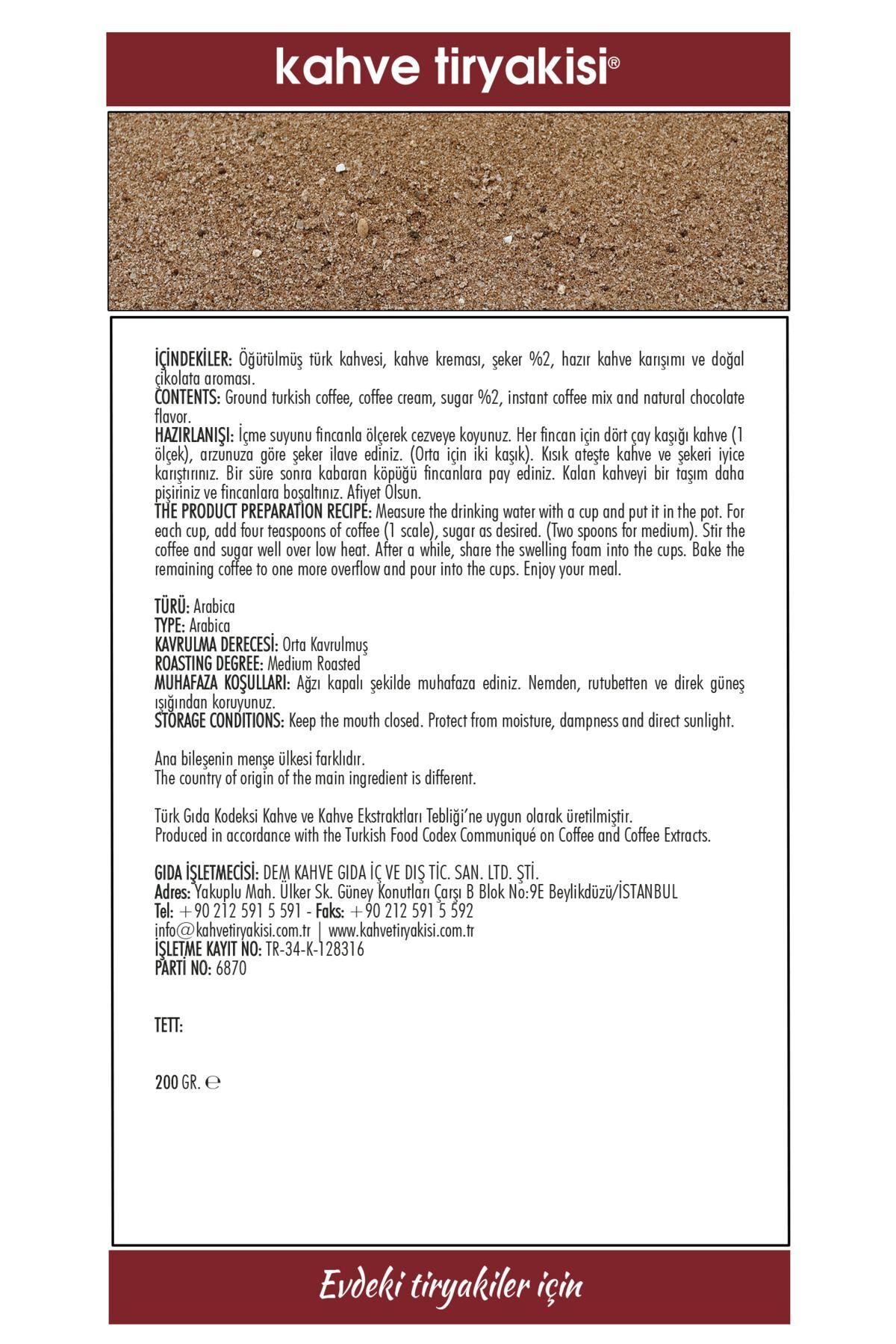 Çikolatalı Türk Kahvesi 200 gr Çekirdek türü:% 100 Arabica Kavrulma Derecesi:Orta İşlenme Türü:Yıkanmış Tadım Notu: Çikolatalı Türk Kahvesi, geleneksel Türk kahvesinin karakteristik lezzetini, enfes çikolata notalarıyla buluşturan bir lezzet şölenidir. ; Yoğun kahve aroması, tatlı ve hafif acımsı çikolata dokunuşlarıyla muhteşem bir denge oluşturur, damaklarda unutulmaz bir tat bırakır. ; Her bir yudumda tatlı çikolata ile kahve arasında mükemmel bir uyum hissedilir, bu içecek tutkulu kahve severler için gerçek bir zevk kaynağıdır. ; Şimdi deneyin ve çikolatanın eşsiz tadıyla kahve keyfini doruklarda yaşayın!;