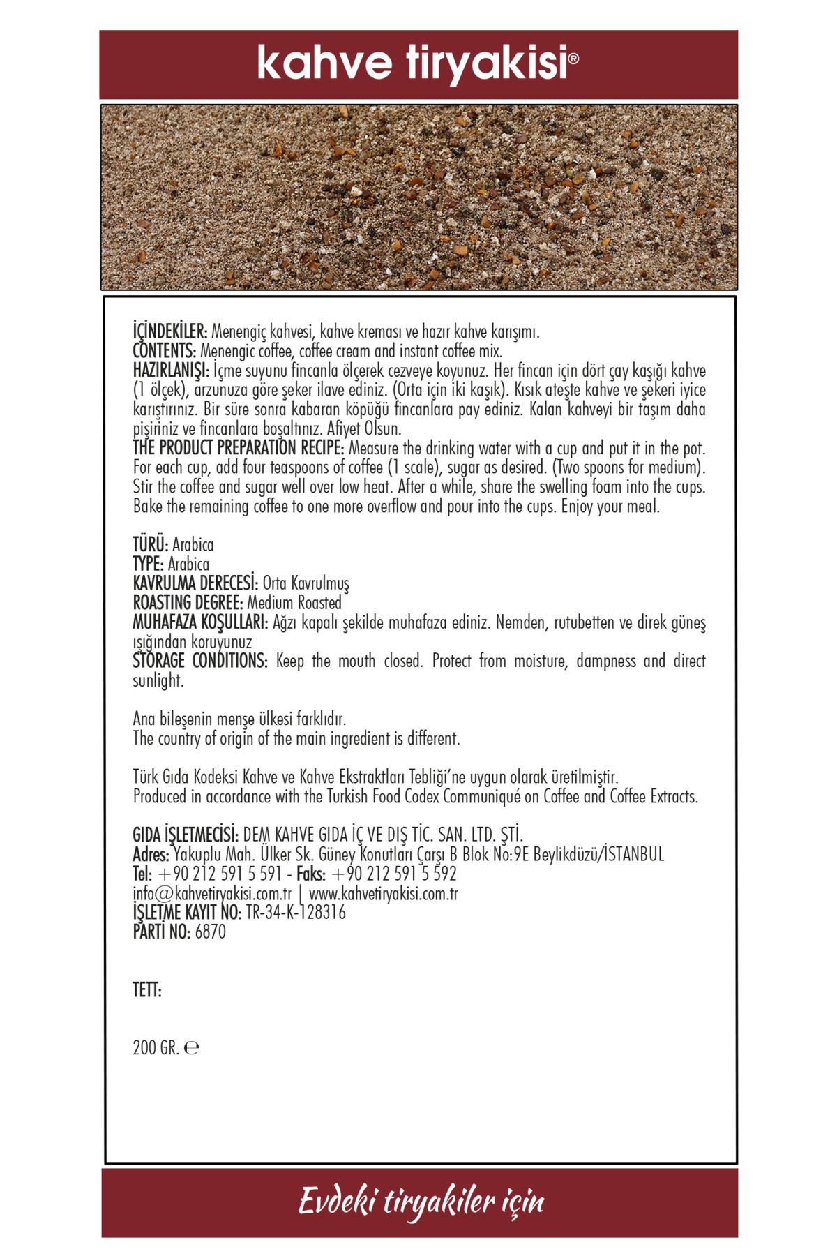 Menengiç Kahvesi 200 gr Çekirdek türü: % 100 Arabica Kavrulma Derecesi: Orta İşlenme Türü: Yıkanmış Tadım Notu: Menengiç Kahvesi, doğanın armağanı menengiç ile özenle harmanlanır ve hazırlanır.